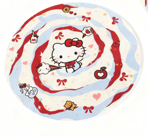 - Hello Kitty: Red-blue swirl base with Hello Kitty (wearing red bow) + small decor (milk bottle, heart, apple)