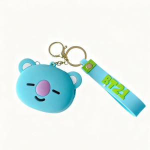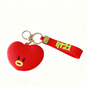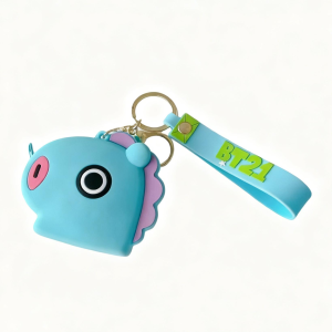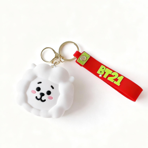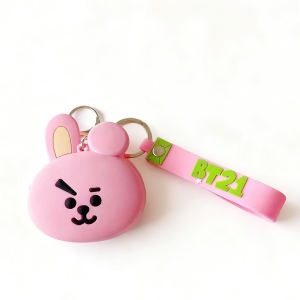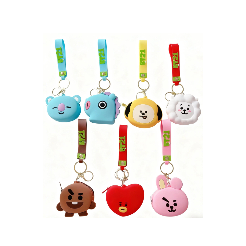 - Material: Food-grade safe silicone (soft, waterproof, odorless, and deformation-resistant) + durable color-matched wrist strap (printed with “BT21” logo) + rust-proof metal keychain — safe for daily use and easy to clean.